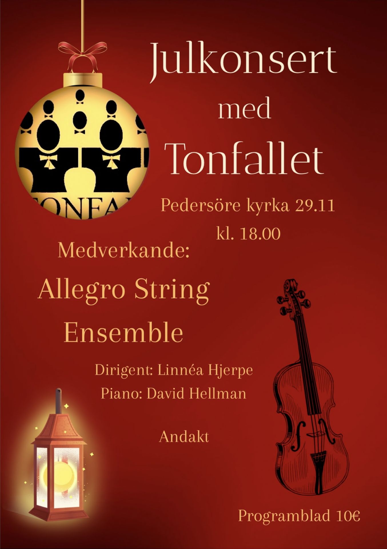 Efter ett års uppehåll är Tonfallets julkonsert åter tillbaka i Pedersöre kyrka. I år gästas vi av strängorkestern Allegro String Ensemble från Jakobstad. David Hellman kompar kören på piano och dirigent är Linnéa Hjerpe.